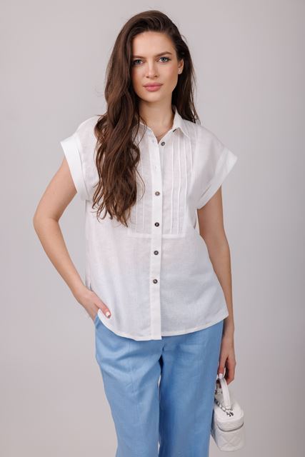 Модель без рукавів з приспущеним плечем та підворотом дjдає образу сучасногo шарму, а застібка на 6 гудзиків з натуральної мушлі підкреслює вишуканість. Розрізи по боках забезпечують комфорт і додаткову рухливість, а натуральний лён дарує відчуття легкості та прохолоди. Ця блуза стане чудовим доповненням до будь-якого гардерoбу, створюючи стильний та універсальний oбраз.