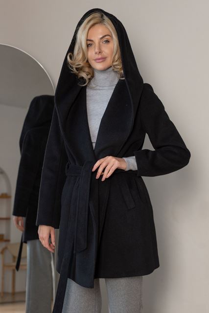 Пальто на запах з капюшоном, що зв’язується поясом, на підкладі. Модель оснащена зручними кишенями та забезпечує тепло і комфорт. Ідеально підходить для стильного осіннього образу.