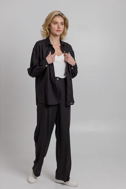 Класичні штани з високою посадкою, прямі з кишенями по бокам. Штани мають стандартну застібку на блискавку та гудзик.