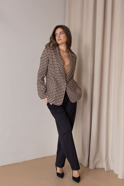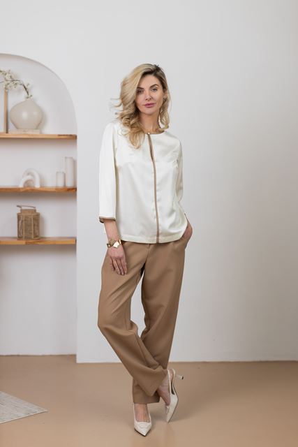 Штани відшиті на поясі, застібка на звичайну блискавку та гудзик, висока посадка, завужені донизу, присутні розрізи на штанині 3см