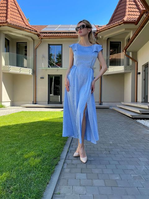 Сукня легка і невагома. Елегантний напівприталений силует із розрізом попереду. Рукав-крильце, виріз горловини круглий, два тоненькі паски по бокам.