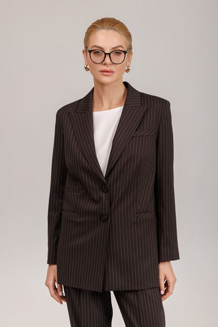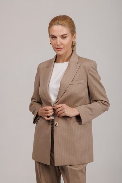 Жакет класичний, приталеного силуету довжиною 70-73см, на підкладці. Рукав довгий, прямий. Лацкан класичного крою, по пілочці функціональна кишеня. Застібка на два ґудзика. По спинці є подвійна шліца. Чудовий варіант для створення яскравого образу в діловому стилі. Поєднуються штанами з цієї тканини.