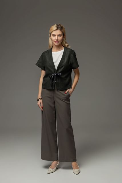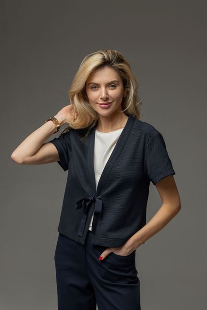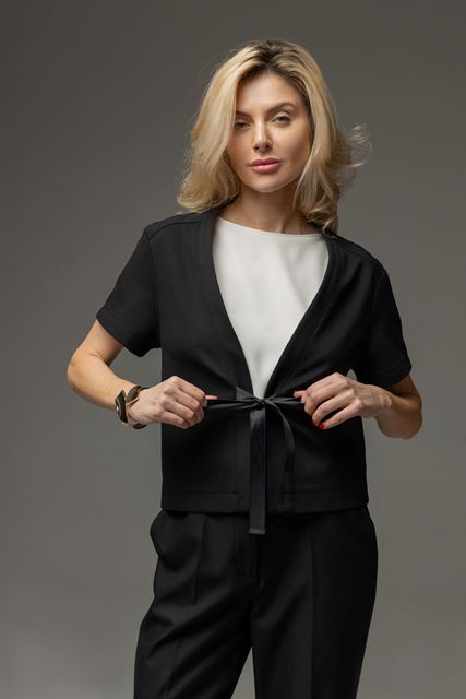 Модель виконана без підкладки, що робить її легкою та комфортною для щоденного носіння. Усі внутрішні шви акуратно оброблені руліком, що забезпечує охайний вигляд виробу навіть зсередини. Застібається на зав’язку-тасьму, яка додає ніжності та дозволяє регулювати посадку. Короткий рукав робить жакетик універсальним варіантом для теплої пори року або як стильний шар у багатошарових образах.
