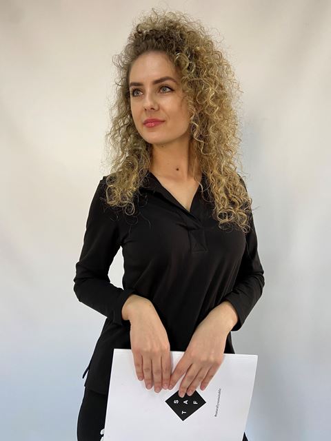 Простий базовий крій моделі прикрашений коміром-поло та V-подібним вирізом. Тканина приємна на дотик, м'яка, трохи тягнеться, що дозволяє добре сідати на будь-який тип фігури. Стильно й елегантно виглядає в поєднанні з брюками, спідницями, джинсами різних відтінків.