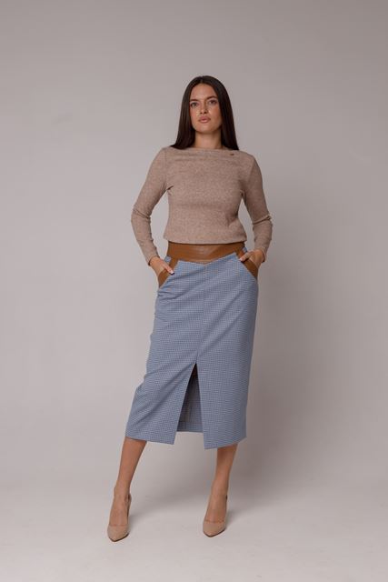 Модель з високою посадкою та розрізом посередині. Спідниця має рівний оброблений низ, застібається на приховану блискавку ззаду. Спідниця на підкладі, пояс з еко-шкіри.