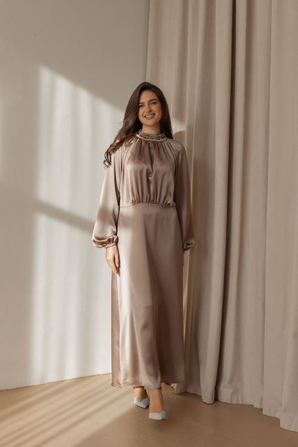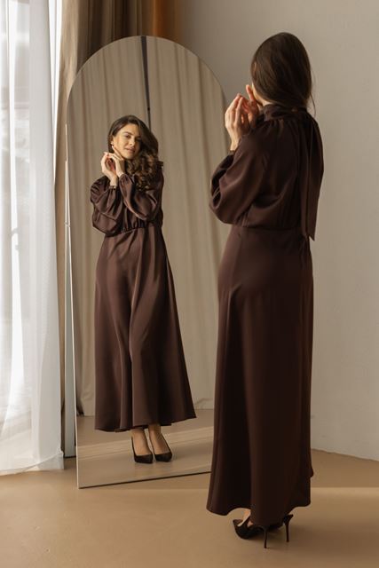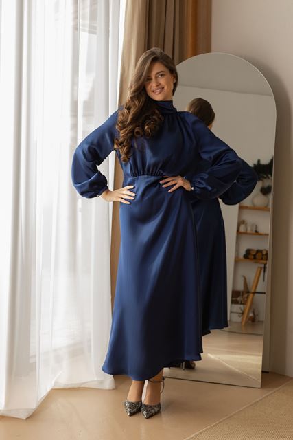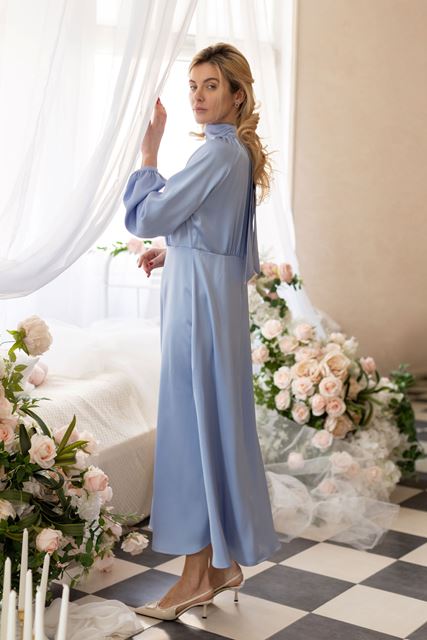 Сукня ідеально підходить для коктейльних заходів, святкових подій та особливих вечорів. Представлена у чотирьох трендових кольорах: блакитному, насиченому синьому, шоколадному та бежевому.